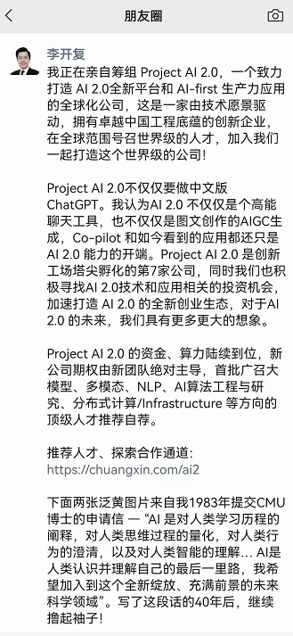 昨日下午,李开复在朋友圈官宣,要亲自筹组Projevt AI 2.0,一个致力打造AI 2.0全新平台和AI-first生产力应用的全球化公司。