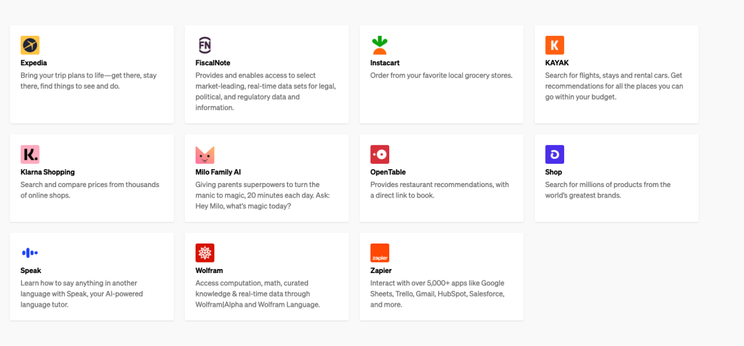 这是 AI 的 App Store 时刻,AI 经历了「iPhone」时刻后,如今也有了应用商店。这些插件使 ChatGPT 能够与开发人员定义的 API 进行交互,极大增强 ChatGPT 的功能,适应无数广泛的场景。