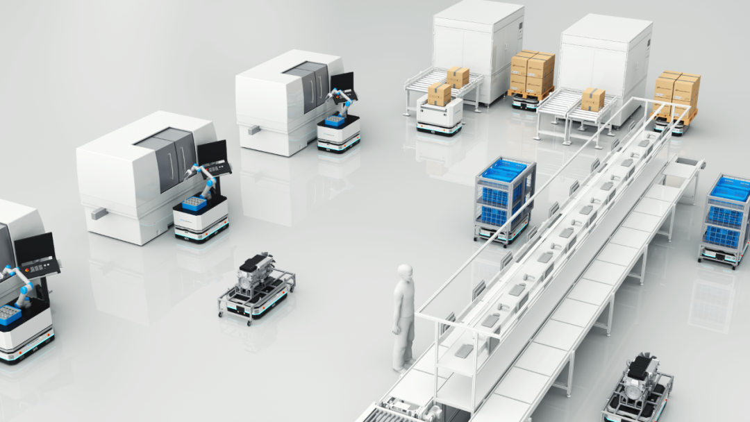 事实上,AMR搬运物料的流程大多类似:从仓库将物料运送至产线,放下物料,再搬起旁边的空料箱运回仓库,这个完整的运输流程就可以固化成一个模块。