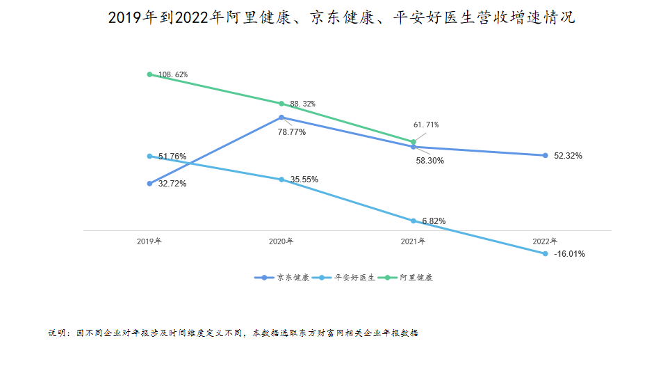 从具体公司来看,京东健康表现相对稳定。得益于疫情期间消费者对医疗物资和药品的需求增加,过去几年京东健康整体业绩表现优异。将京东健康和同行业的平安好医生、阿里健康业绩进行对比后可以发现,2020年三家互联网医药平台业绩均出现不同程度增长,但此后阿里健康、平安好医生增速已出现明显回落,但京东健康的业绩增速整体相对稳定。