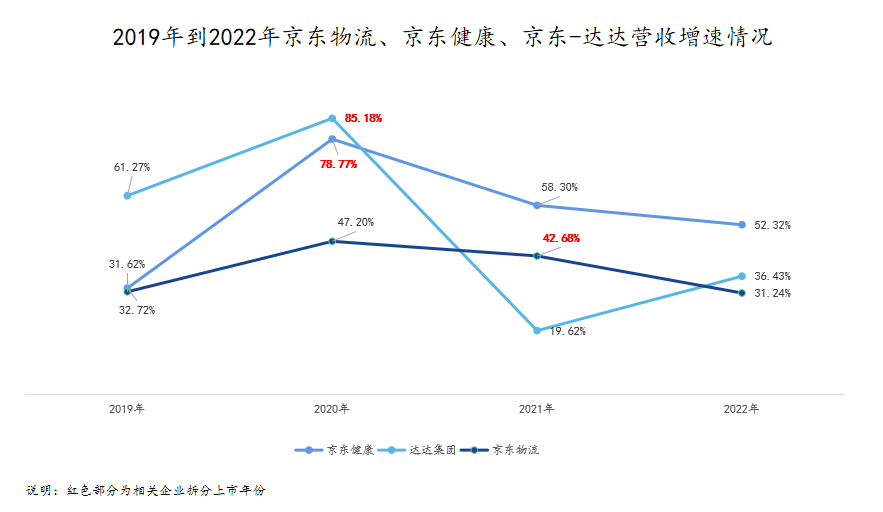 为全面评估京东系上市公司的成长性,我们将达达、京东健康、京东物流上市前后的业绩进行对比,虽然三家企业业绩均实现了正向增长,但京东健康的增速最快,京东物流整体表现相对平稳,达达业绩整体业绩波动性较大。