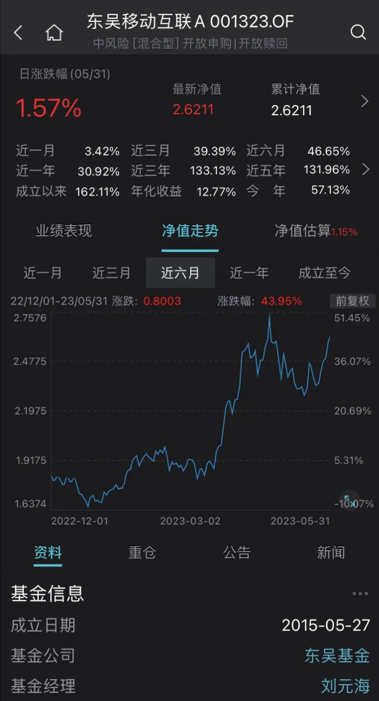 紧随其后的是刘海元管理的东吴移动互联A,前5月的收益率达到57.13%,也展示出抓住市场机遇的强劲能力。