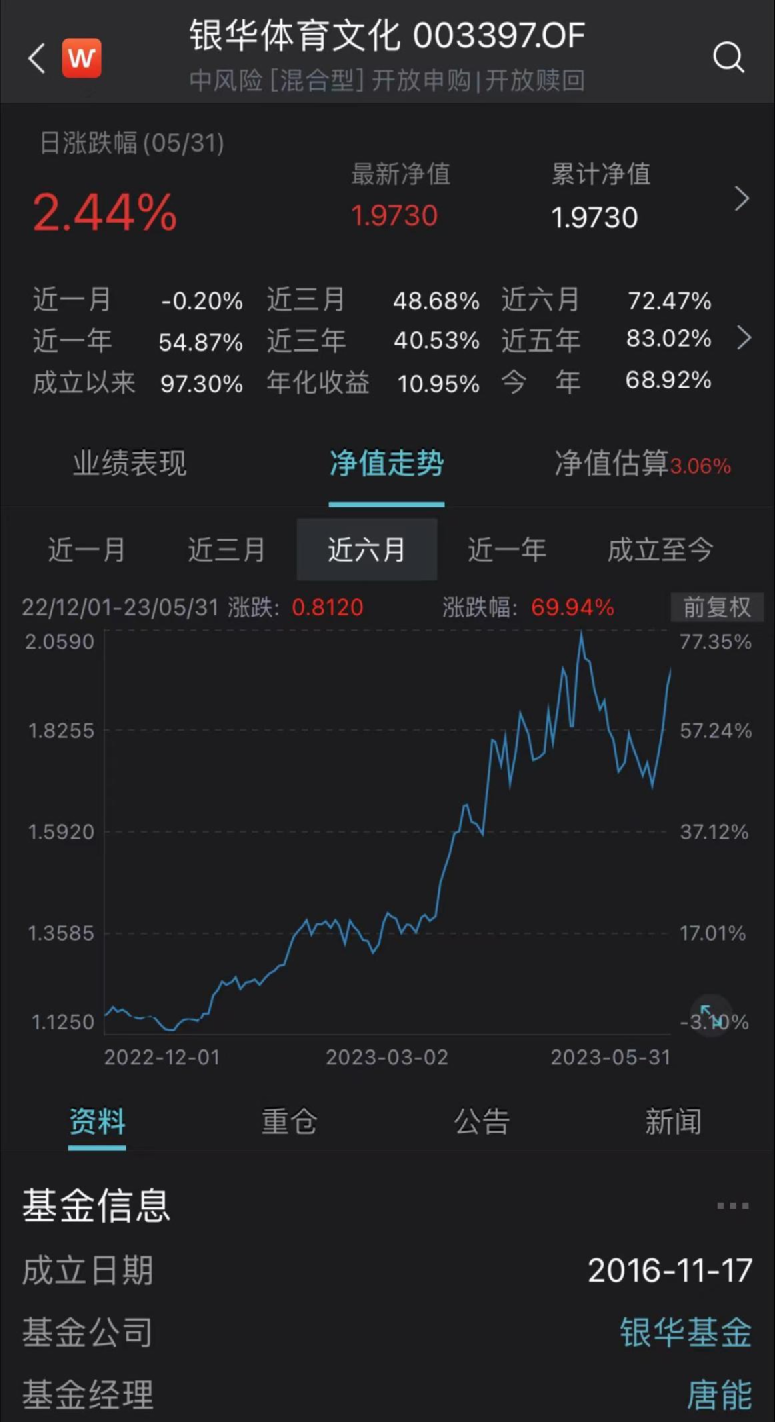数据显示,目前唐能管理的银华体育文化基金以68.92%的收益率领跑全部的主动权益基金,该基金主要重仓今年涨势如虹的游戏、传媒领域,一季度重仓吉比特、三七互娱、昆仑万维、恺英网络、三六零等,其中昆仑万维、三六零、神州泰岳等今年以来涨幅都超100%。