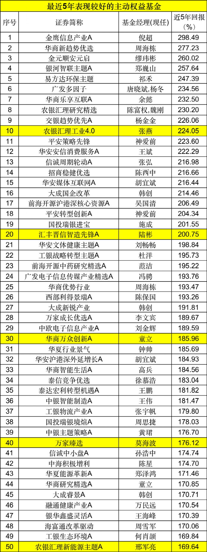 从近五年的情况看,倪超管理的金鹰信息产业业绩回报达到了298.49%,在主动权益基金中排列第一。紧随其后的是周海栋管理的华商新趋势优选,近五年业绩回报也达到了277.23%。