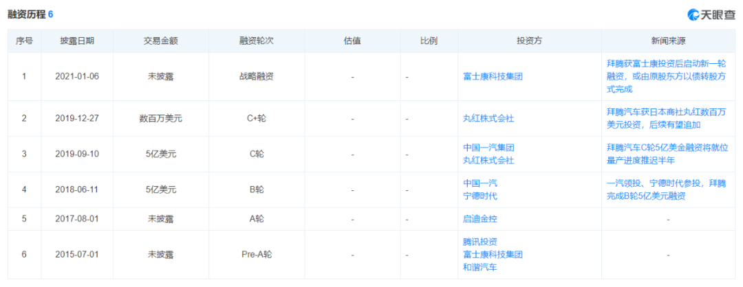 凭借雄厚背景和豪华明星团队,拜腾汽车自然而然吸引了各路资本的目光。据天眼查信息显示,拜腾汽车共完成6轮融资,投资团队整容强大,其中不乏富士康、一汽集团、宁德时代、腾讯投资、丸红株式会社等明星机构,总融资金额高达84亿元。